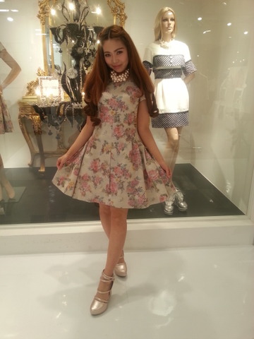 ジャガード織りにプリントし、さらにその上に華麗な刺繍を施した既製服にはあり得ないベルサイユファブリックを、構築的なデザインで作り上げた、まさにロココモダンなワンピースです。画像よりも是非実物をお手にとってご覧頂きたい特別な一品です。